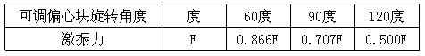 振動電機每端出軸均有一個固定偏心塊和一個可調(diào)偏心塊,調(diào)節(jié)可調(diào)偏心塊和固定偏心塊之間的夾角可改變激振力的大小。出廠時可調(diào)偏心塊和固定偏心塊之間的夾角為0度,這時的激振力為振動電機的額定激振力F,不同夾角時的激振力如表: